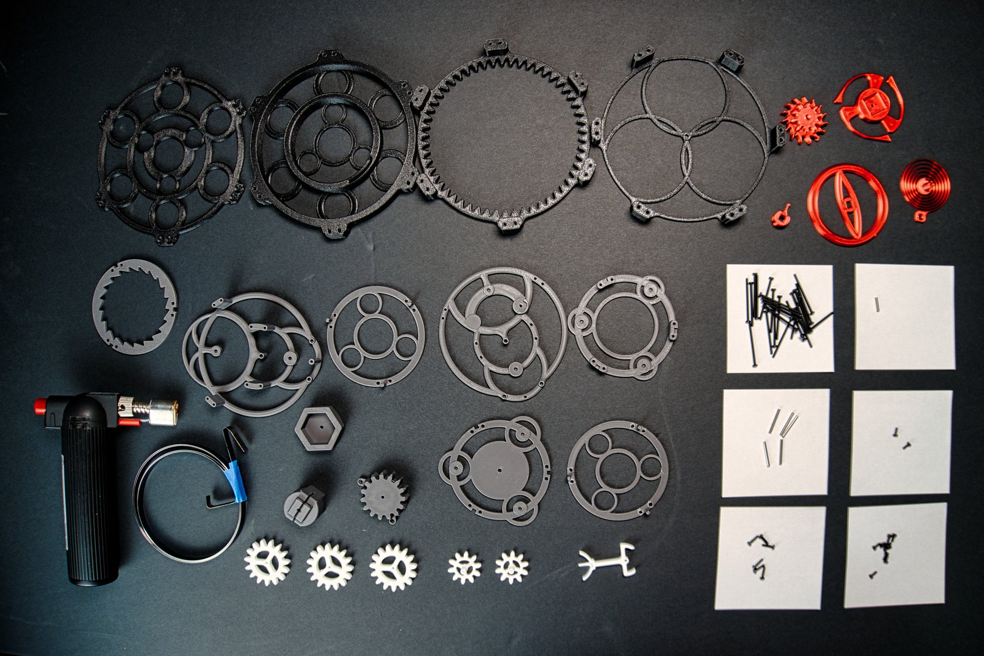 With 26 printed parts, a hand-wound spring steel mainspring, and over 40 screws & dowels, this art piece is assembled and tested by hand every time.